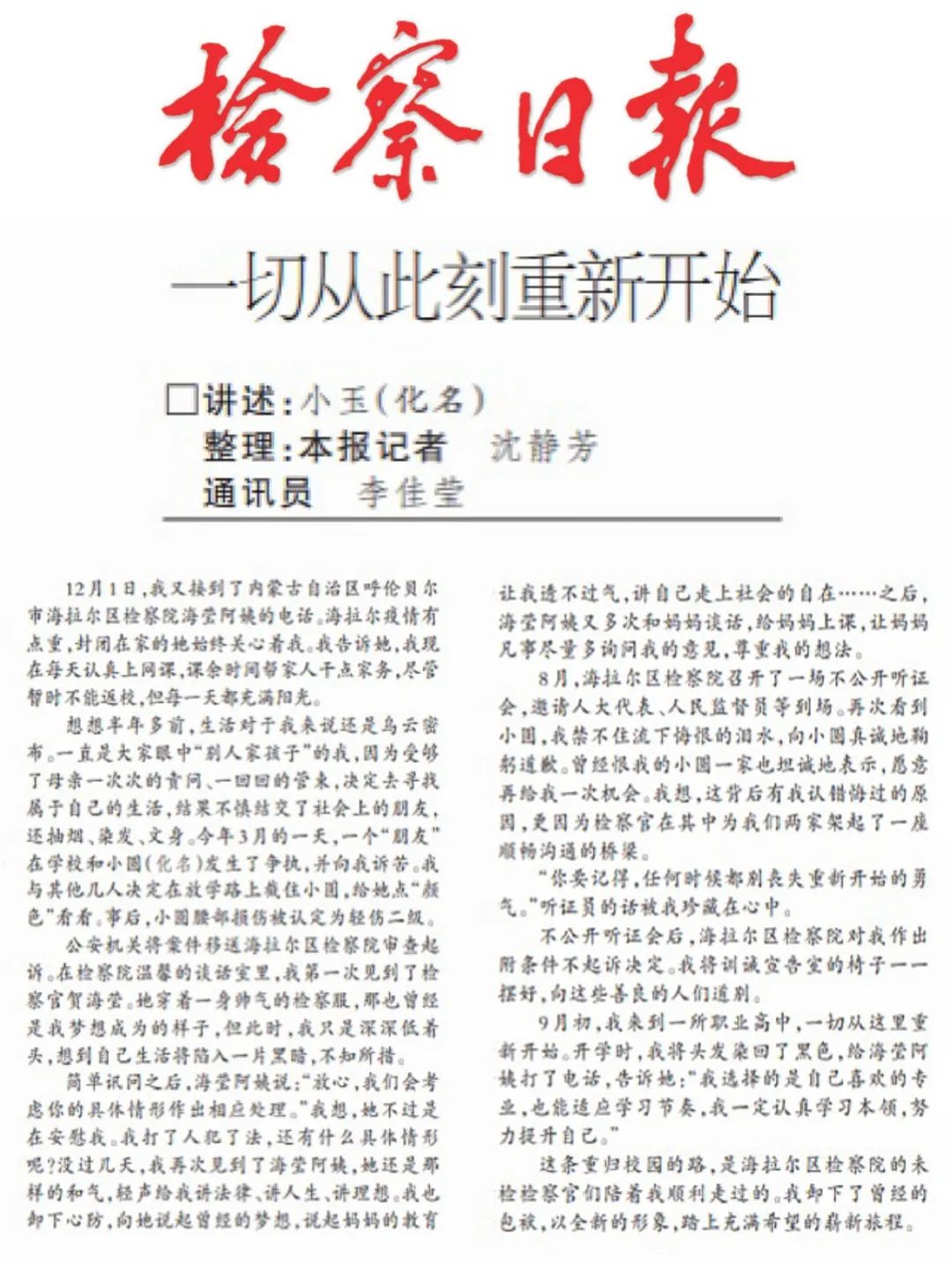 12月8日《检察日报》第5版 12月1日,我又接到了内蒙古自治区呼伦贝尔市海拉尔区检察院海莹阿姨的电话。海拉尔疫情有点重,封闭在家...